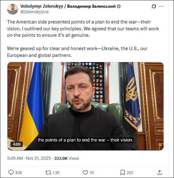 泽连斯基10月23日曾表示,与俄罗斯进行任何形式领土交换都“不可接受”。但他21日在X平台上发布视频声明,并写道:“美方提交了结束战争的计划要点——这是他们的愿景。我阐述了我们的核心原则。双方一致同意,两国团队将围绕这些要点开展工作,确保所有内容都切实可行。”