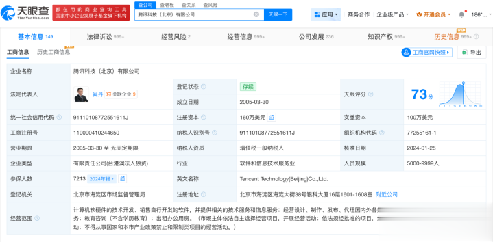 天眼查App显示,腾讯科技(北京)有限公司成立于2005年3月,法定代表人为奚丹,注册资本160万美元,经营范围包括计算机软硬件的技术开发、销售自行开发的软件,并提供相关的技术服务和信息服务等。